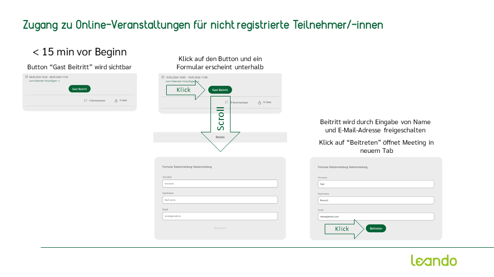 - Als nicht registrierte Nutzer/-innen des Leando-Portals: Am Veranstaltungstag (14. Mai) finden Sie ab 15 Minuten vor Veranstaltungsbeginn auf dieser Seite den Button "Gast Beitritt", mit dem Sie auch ohne vorherige Registrierung und Anmeldung am Webinar teilnehmen können. Eine genaue Anleitung finden Sie unten im Anhang. Gerne können Sie sich aber im Vorfeld des Termins auf Leando registrieren!