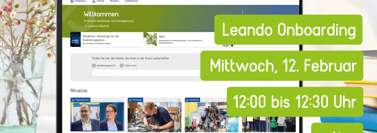 In diesem virtuellen Onboarding-Call stellen wir Ihnen die vielfältigen Funktionen, Tools und Möglichkeiten von Leando vor. Lernen Sie das Portal kennen und erfahren Sie, wie es Sie in Ihrem Ausbildungs- und Prüfungsalltag optimal unterstützen kann.