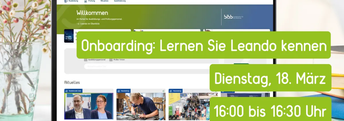 In diesem virtuellen Onboarding stellen wir Ihnen die vielfältigen Funktionen, Tools und Möglichkeiten von Leando vor – und das in nur 30 Minuten. Lernen Sie das Portal kennen und erfahren Sie, wie es Sie in Ihrem Ausbildungs- und Prüfungsalltag optimal unterstützen kann: